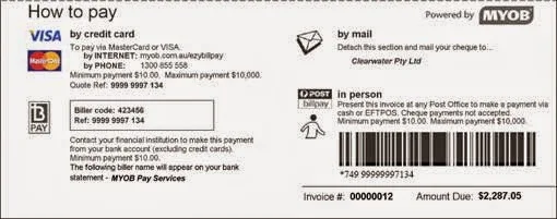 교민들이 가장 많이 사용하는 MYOB의 경우 다음과 같이 VISA, Master 카드및 BPay, Postpay등등 여러가지 옵션을 제공합니다.